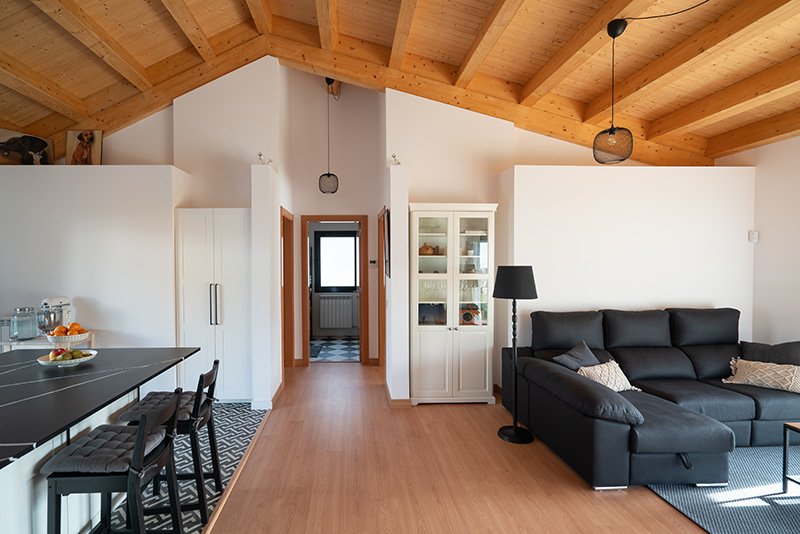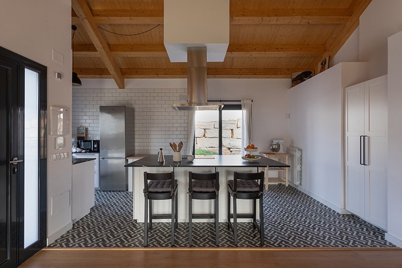 Per maximitzar la sensació d’amplitud de l’espai s’ha optat per generar un espai principal diàfan que permet la flexibilitat dels usos. Sostres alts amb la coberta inclinada de fusta vista. Allargar les visuals ubicant estratègicament les finestres, de tal manera que s’incorporen els patis a l’espai interior.