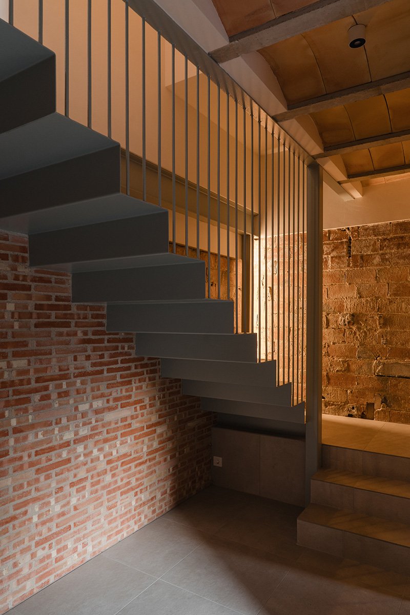En aquesta línia, també s’han conservat altres elements originals, com els maons ceràmics manuals, cuits de manera irregular, que s’han deixat vistos a l’àmbit de l’escala.