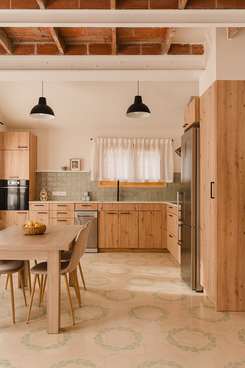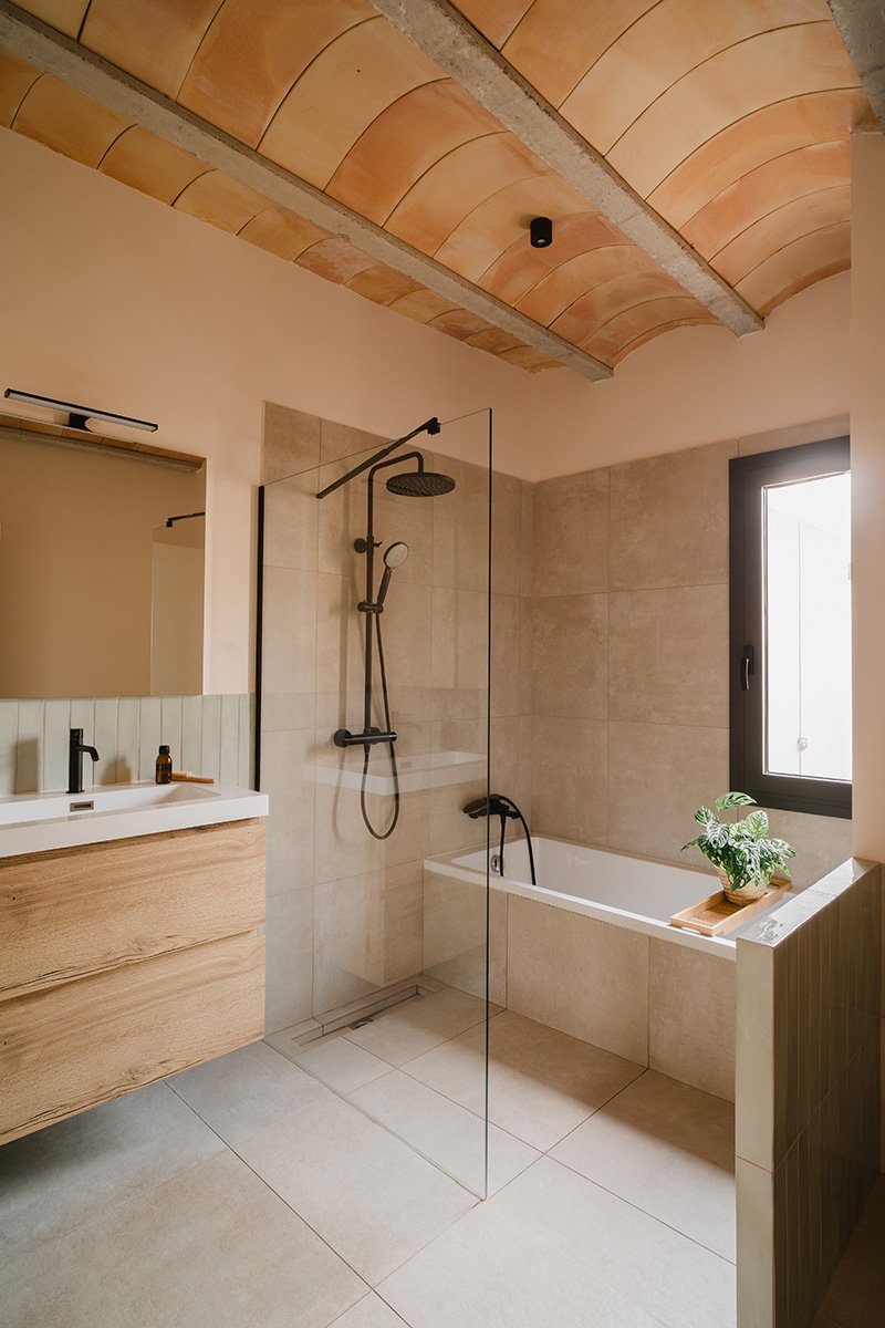La transformació de la casa ha estat profunda. Es va rebaixar el nivell del terra per eliminar completament les humitats i incorporar un bon aïllament. S’hi va instal·lar terra radiant, que funciona a baixa temperatura (40 °C) i, combinat amb un sistema d’aerotèrmia, garanteix un alt confort amb una despesa energètica molt reduïda.